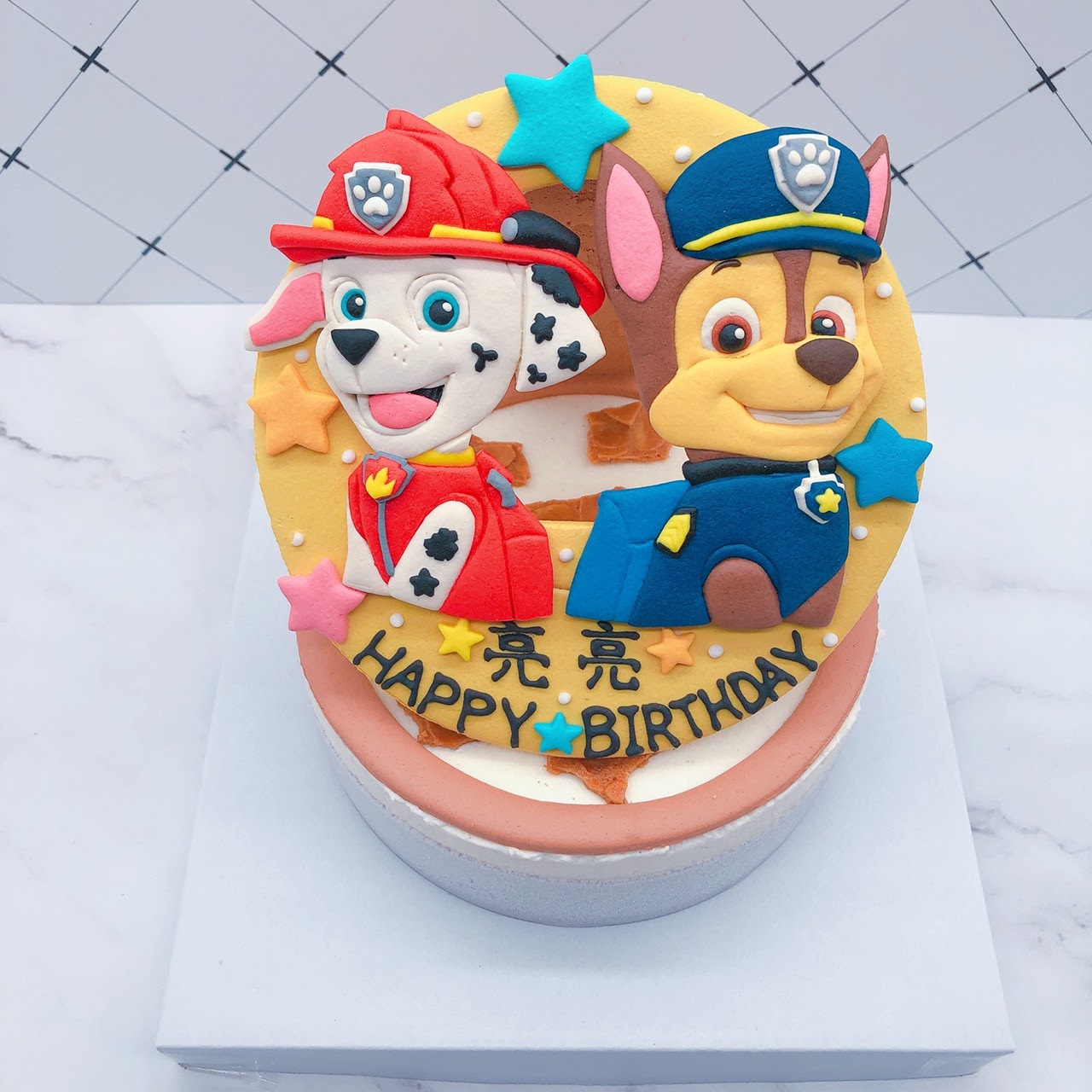 但我家寶貝兒子最愛的是身為警察的阿奇和消防員毛毛,所以我選擇這兩隻造型來製作,先給大家看一下汪汪隊客製化蛋糕的作品吧~